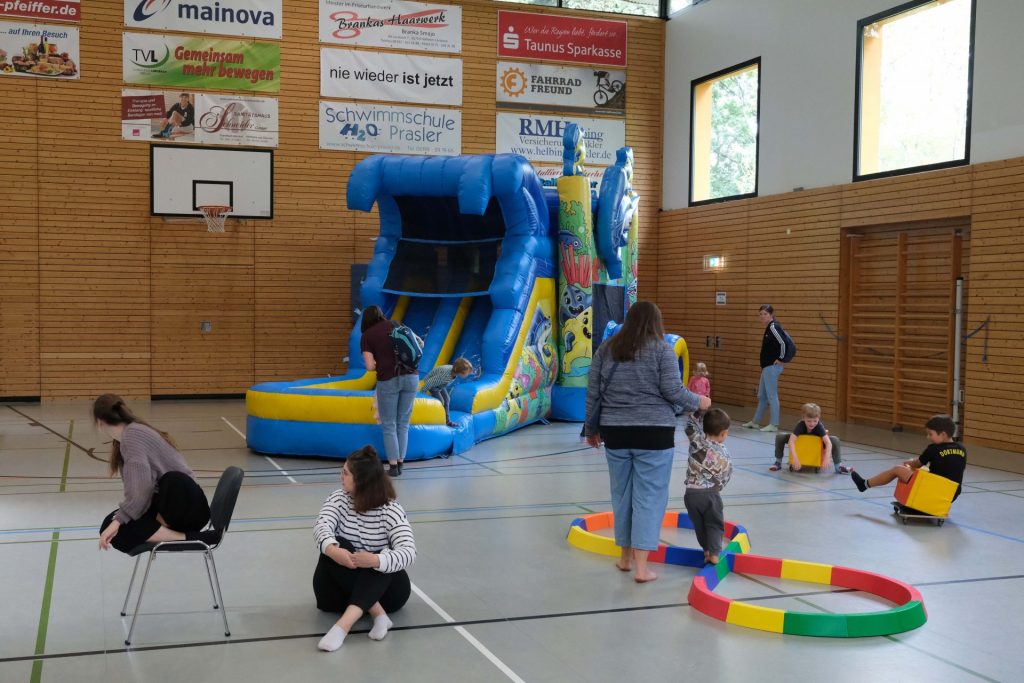 Für die jüngeren Besucher stand in der Turnhalle von Hüpfburg über einen anspruchsvollen Balancierparcours bis zu Spielmöglichkeiten für die Kleinsten ein breit gefächertes Angebot zur Verfügung, so dass sich diese Altersgruppe erst zum Ende der Veranstaltung aus der Halle losreißen konnte und zum reichlich bestückten Buffet mit Obst, Kuchen, Salaten und Bratwurst eilte. Dank vieler Spenden wurden Wasser, Kuchen und Obst kostenlos ausgegeben. Schleckermäuler konnten mit etwas Geschick Schokoküsse mithilfe der Schokokuss-Schleuder verzehren. Wer ohne Reue schlemmen wollte, konnte sich vor dem Fest unter der kundigen Leitung von Ingrid Weise bei einer Wanderung den Kuchen erarbeiten.