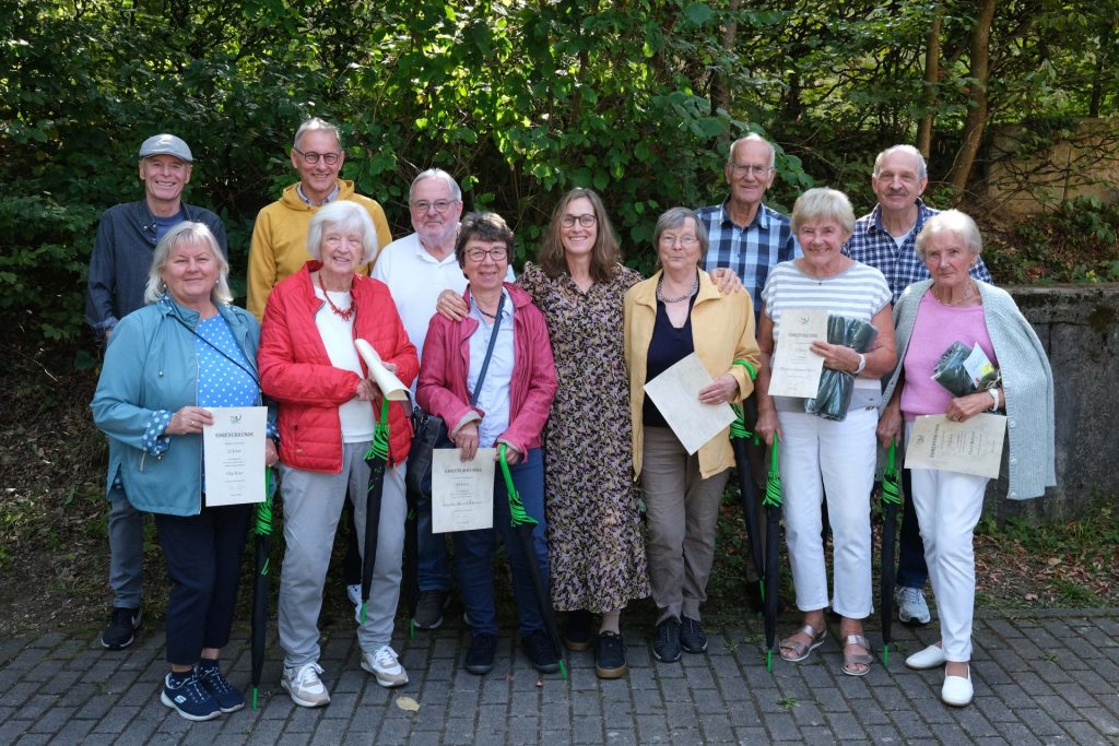 Die Ehrungen der Jubilare erfolgte durch Vorstandssprecherin Silke Niedernhöfer entlang der Vereinshistorie, zu der es auch eine kleine Bildergalerie gab. Bemerkenswerterweise waren die Jubiläumsjahre immer auch Jahre des Umbruchs und der Erneuerung, und die Geschichte des Turnvereins ist geprägt von Engagement und gemeinsamen Anpacken. 1885 erfolgte die Gründung durch den Turner Theodor Fischer. Fünfzig Jahre später -also im Jahr 1935- startete der Bau der alten Turnhalle. In den 50er Jahren war das Hauptthema die Suche nach einem Sportplatz für die Hand- und Fußballer. Vor 70 Jahren -also 1955- traten die Zwillinge Heidi und Hiltrud Weyel als aktive Turnerinnen ein, sie begleiten den Verein also schon die Hälfte seiner Existenz. Später wechselten beide zur Leichtathletik und leiteten jahrelang das Sportabzeichen Training. Auch heute trifft man die Zwillingsschwestern auf dem Weg zum Sport: „Wir müssen mal wieder ein paar Kugeln stoßen.“